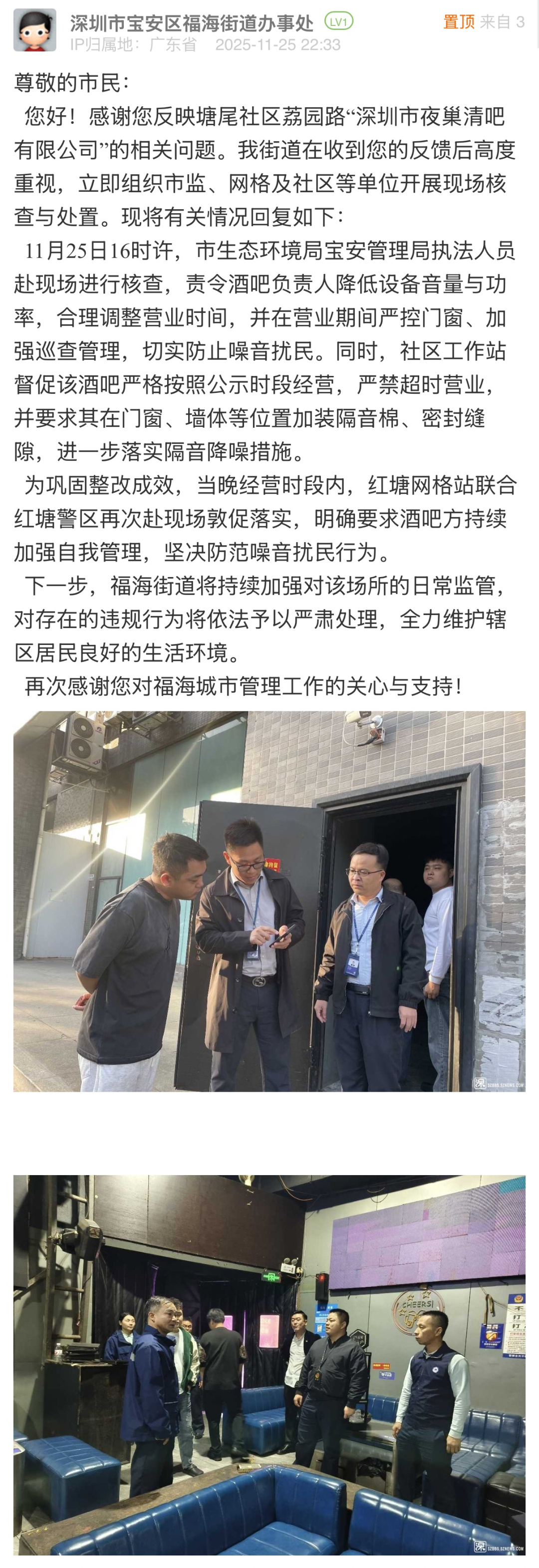 案例點(diǎn)評(píng):針對(duì)市民反映的問題,福海街道辦與市生態(tài)環(huán)境局寶安管理局快速響應(yīng)、協(xié)同處置,在24小時(shí)內(nèi)組織工作人員開展線下核查,現(xiàn)場(chǎng)責(zé)令店鋪整改,嚴(yán)禁其超時(shí)營(yíng)業(yè),并要求加裝隔音棉、密封縫隙,加強(qiáng)降噪。在發(fā)出整改要求當(dāng)晚,網(wǎng)格站聯(lián)合警區(qū)再次到現(xiàn)場(chǎng)復(fù)查,督促整改要求落實(shí),同時(shí)公開執(zhí)法圖片向公眾反饋處置進(jìn)展,有效回應(yīng)市民關(guān)切,體現(xiàn)了務(wù)實(shí)高效的工作作風(fēng)。