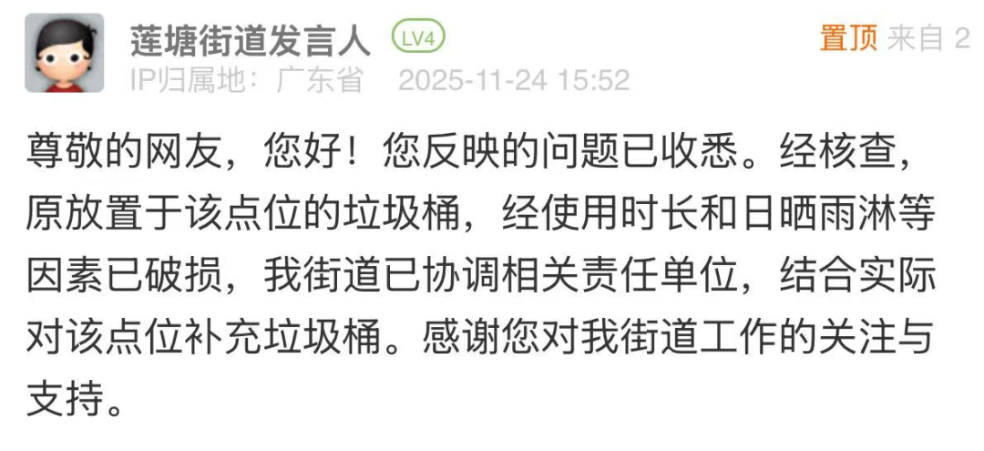 案例點評:針對市民反映“垃圾桶無故取消”的問題,街道辦在3小時內完成核查,清晰說明垃圾桶搬離原因,同時迅速協調相關責任單位,結合實際情況明確將為該點位補充垃圾桶,切實解決群眾投放垃圾的剛需。此次處置迅速有效,既體現了直面民生訴求、不推諉不拖延的工作態(tài)度,也展現了精細化治理能力,為后續(xù)環(huán)衛(wèi)設施維護和民生需求響應提供了范本。