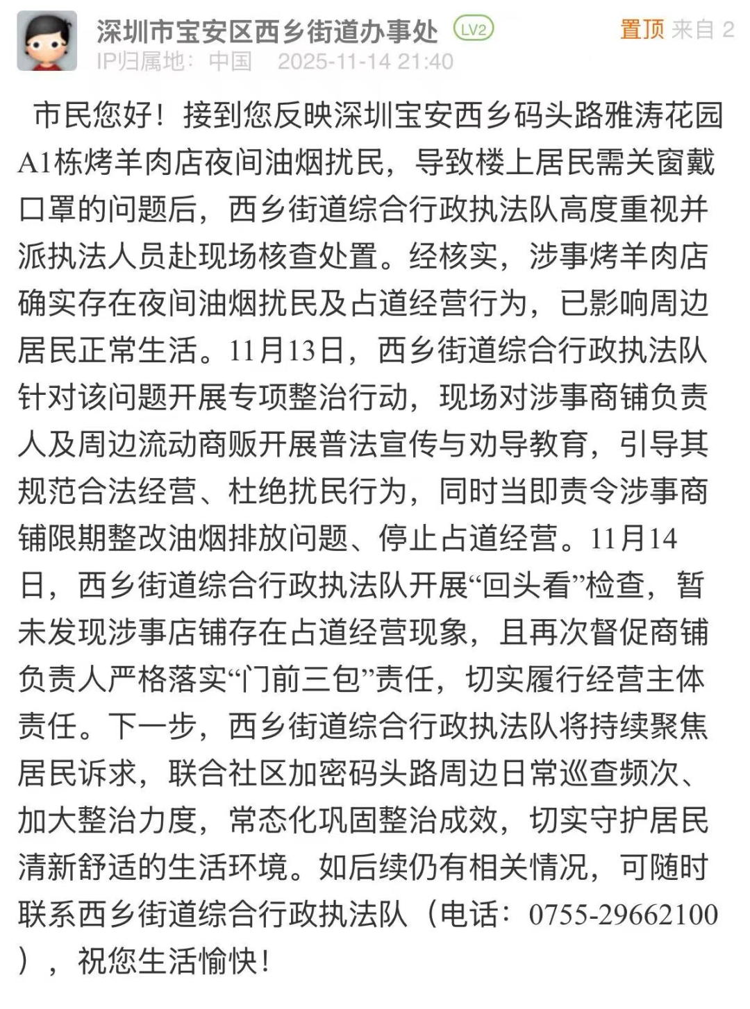 案例點評:接到市民反映后,街道迅速響應,當日開展核查,次日回應進展,處置高效。針對涉事店鋪油煙問題,執(zhí)法隊不僅現場開展普法勸導,責令商鋪限期整改,更在次日開展“回頭看”檢查,及時跟進整改進度、壓實經營主體責任?;貞?,街道明確下一步將聯合社區(qū)加密日常巡查、加大整治力度,常態(tài)化鞏固整治成效,體現出緊盯民生痛點、深耕基層精細化治理、全力守護居民舒適生活環(huán)境的決心。