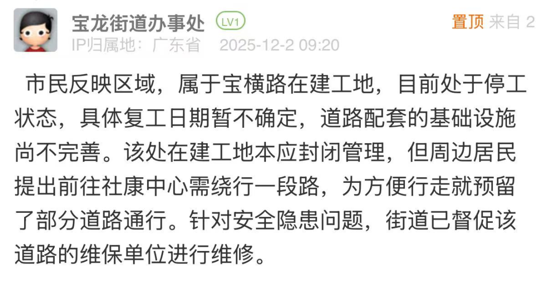 優(yōu)化建議:針對市民反映的道路在建工地預留道路路燈暗淡、路磚碎裂等問題,帖文回應存在“解釋多、舉措少”的短板,未能化解群眾多次投訴無果的不滿。同時,“復工日期暫不確定”的表述易引發(fā)市民的疑惑與不滿,后續(xù)有市民在評論區(qū)反饋該道路仍未啟動維修工作,建議責任單位主動協同項目建設、施工等責任主體,明確給出復工的預估時間或階段性處置方案及臨時性保障措施,推動問題解決。