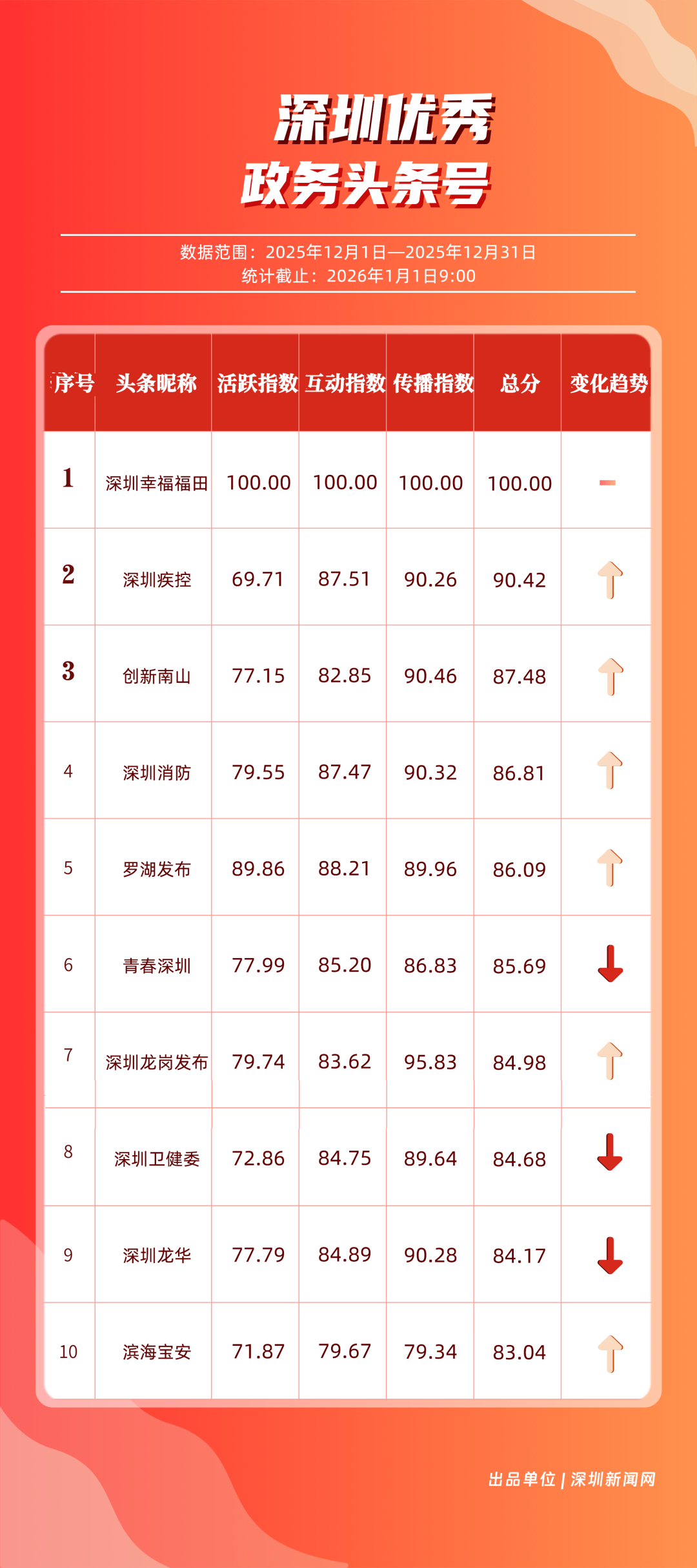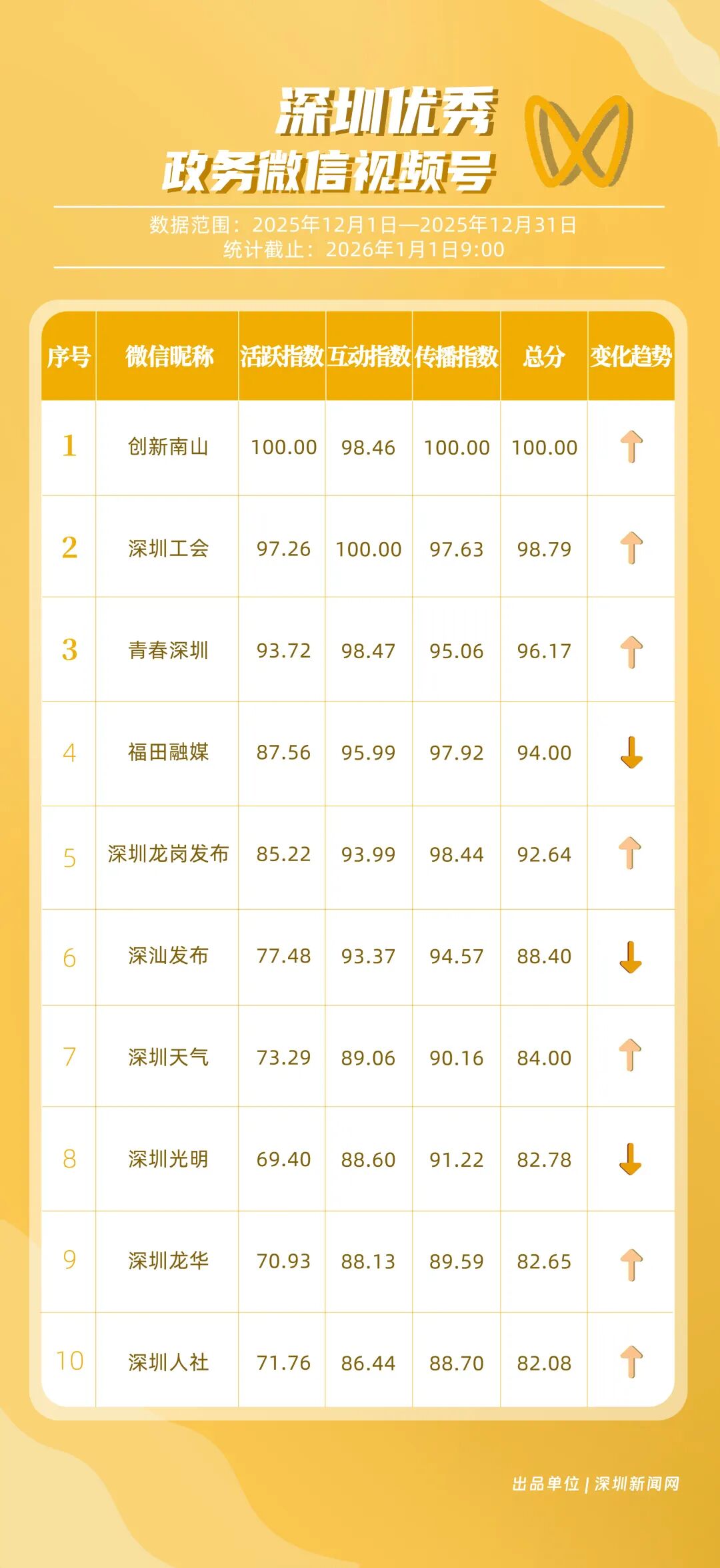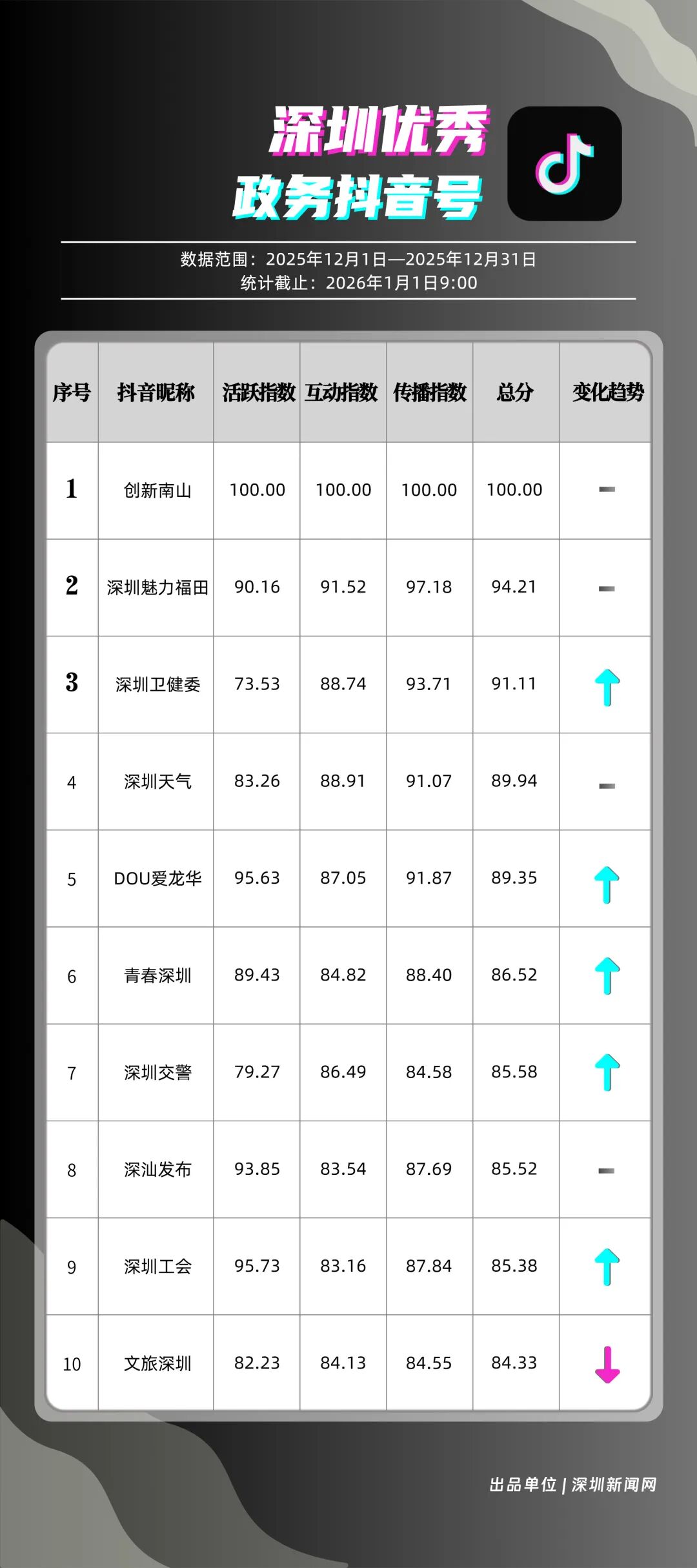 12月,深圳政務(wù)新媒體矩陣持續(xù)深耕內(nèi)容生態(tài),各單位依托平臺特色深化服務(wù)效能,南山區(qū)、福田區(qū)、市衛(wèi)生健康委員會、市總工會、龍崗區(qū)、市氣象局(臺)、光明區(qū)、中國共產(chǎn)主義青年團(tuán)深圳市委員會、龍華區(qū)、深汕特別合作區(qū)的新媒體矩陣入選“深圳優(yōu)秀政務(wù)新媒體矩陣”榜單。12月,南山區(qū)新媒體矩陣中,“創(chuàng)新南山”賬號在抖音平臺保持高質(zhì)量創(chuàng)作態(tài)勢,單賬號單月視頻總點贊量突破120萬,視頻號平臺同樣表現(xiàn)亮眼,單月視頻總轉(zhuǎn)發(fā)量超70萬,憑借雙平臺滿分的傳播表現(xiàn),位居榜單首位;福田區(qū)新媒體矩陣表現(xiàn)均衡穩(wěn)定,在各平臺得分均在92分以上,以93.94分的總成績位列第二;市衛(wèi)生健康委員會新媒體矩陣在微信公眾號持續(xù)輸出專業(yè)優(yōu)質(zhì)內(nèi)容,在該平臺獲得滿分,助力其以92.21分的總分排名第三位。此外,市總工會、龍崗區(qū)新媒體矩陣總分均超90分,以“各美其美”的發(fā)展態(tài)勢,展現(xiàn)深圳政務(wù)新媒體矩陣的蓬勃生機(jī)。