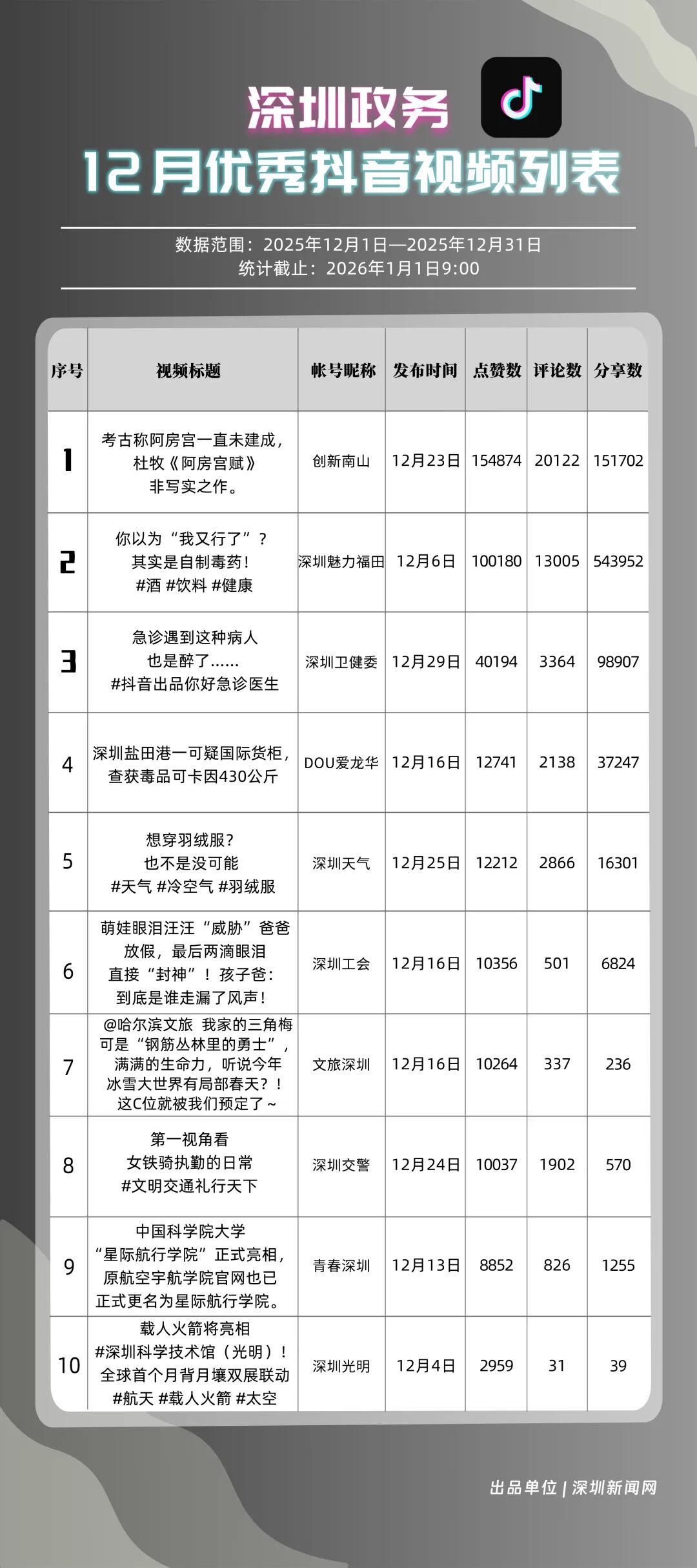 12月,獲得“優(yōu)秀政務(wù)抖音號”稱號的是“創(chuàng)新南山”“深圳魅力福田”“深圳衛(wèi)健委”“深圳天氣”“DOU愛龍華”“青春深圳”“深圳交警”“深汕發(fā)布”“深圳工會”“文旅深圳”?!皠?chuàng)新南山”積極傳播傳統(tǒng)文化、民生健康等多元內(nèi)容,當(dāng)月視頻總點贊數(shù)超120萬,位居榜首;“深圳魅力福田”內(nèi)容激發(fā)用戶主動轉(zhuǎn)發(fā)熱情,在傳播指數(shù)評分較高,位列第二名;“深圳衛(wèi)健委”聚焦民生健康話題,產(chǎn)出高質(zhì)量視頻內(nèi)容,排名上升至第三?!吧钲谔鞖狻薄癉OU愛龍華”“青春深圳”等賬號評分均在86分以上,反映出賬號的內(nèi)容質(zhì)量與用戶粘性突出。上榜政務(wù)抖音號在短視頻傳播賽道持續(xù)深耕,憑借精準(zhǔn)的內(nèi)容定位與創(chuàng)新的傳播手法,成功打造出極具影響力的政務(wù)傳播矩陣。
