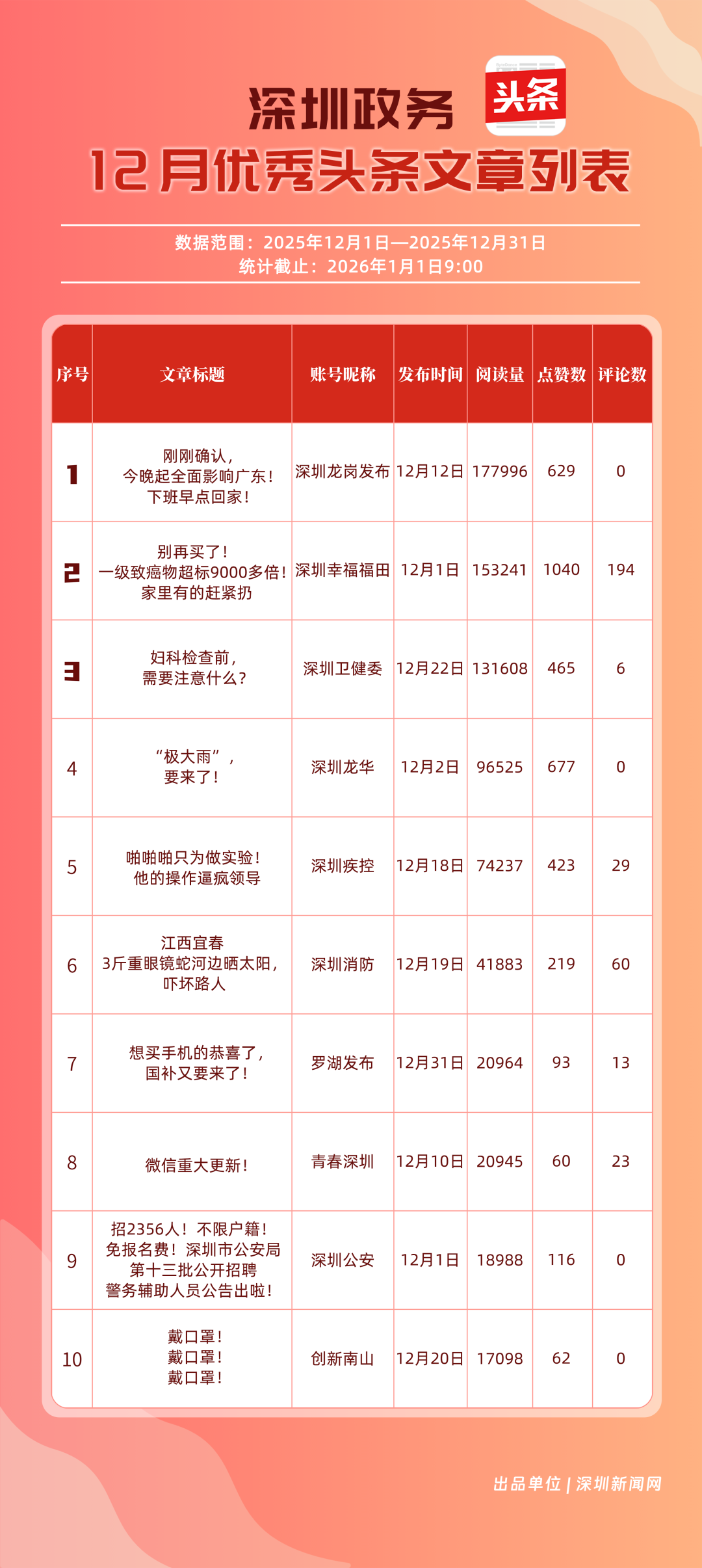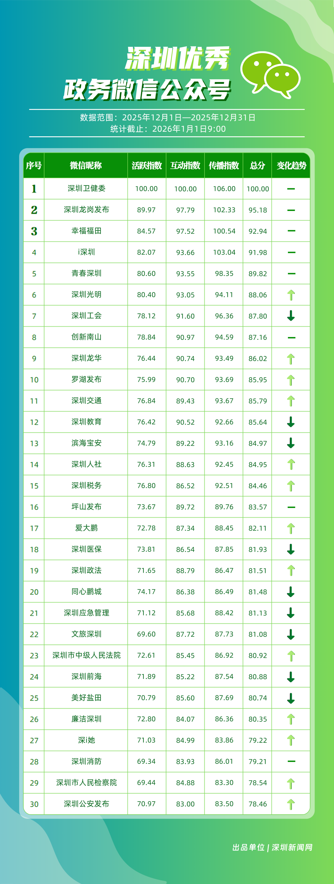 12月,“深圳衛(wèi)健委”“深圳龍崗發(fā)布”“幸福福田”“i深圳”“青春深圳”“深圳光明”“深圳工會”“創(chuàng)新南山”“深圳龍華”“羅湖發(fā)布”等30個政務(wù)微信公眾號榮登“深圳優(yōu)秀政務(wù)微信公眾號”榜單。12月榜單中,頭部政務(wù)賬號優(yōu)勢穩(wěn)固,腰部賬號競爭激烈?!吧钲谛l(wèi)健委”延續(xù)強勁表現(xiàn),在活躍、互動、傳播維度均斬獲滿分,60余篇文章閱讀超10萬,蟬聯(lián)榜首;“深圳龍崗發(fā)布”在互動、傳播方面表現(xiàn)亮眼,穩(wěn)居榜單第二;“幸福福田”也在互動、傳播方面具備一定優(yōu)勢,以穩(wěn)定的內(nèi)容輸出與用戶口碑,居于榜單第三?!吧钲诠饷鳌薄吧钲邶埲A”“羅湖發(fā)布”等政務(wù)賬號不斷拓展信息發(fā)布維度、深化服務(wù)場景打造,排名較上期有所提升。上榜微信公眾號以高質(zhì)量內(nèi)容為核心競爭力,在政務(wù)傳播賽道持續(xù)發(fā)力,為推動政務(wù)信息公開、服務(wù)民生需求搭建了高效的溝通橋梁。