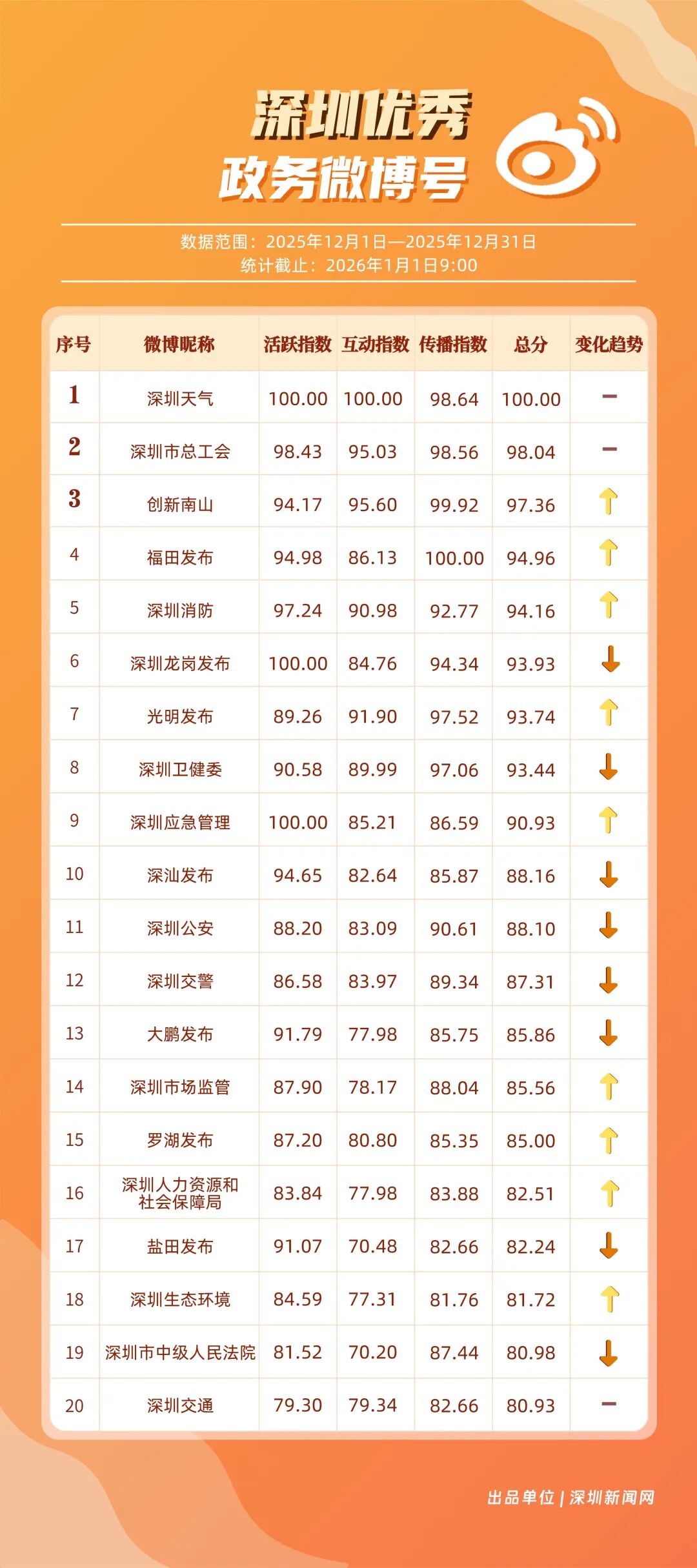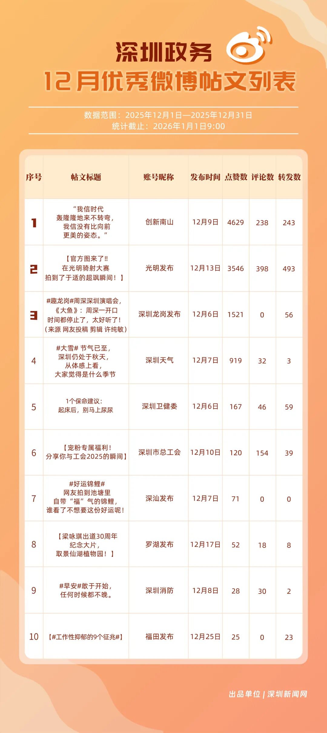 12月,20個賬號入選“優(yōu)秀政務(wù)微博號”榜單,其中包括:“深圳天氣”“深圳市總工會”“創(chuàng)新南山”“福田發(fā)布”“深圳消防”“深圳龍崗發(fā)布”“光明發(fā)布”“深圳衛(wèi)健委”“深圳應(yīng)急管理”“深汕發(fā)布”等。其中,“深圳天氣”精準(zhǔn)化發(fā)布天氣信息,高頻次與網(wǎng)民互動,以滿分成績蟬聯(lián)榜首,彰顯其在民生服務(wù)領(lǐng)域的核心價值;“深圳市總工會”積極發(fā)布互動、福利類內(nèi)容,獲得較高用戶參與度與賬號影響力,居于榜單第二;“創(chuàng)新南山”傳播指數(shù)得分超99分,躋身榜單第三。“福田發(fā)布”“深圳消防”等賬號聚焦民生熱點、強化互動運營,居于榜單前列,且排名有所提升。12月上榜政務(wù)微博賬號持續(xù)發(fā)力,實現(xiàn)了政務(wù)信息的有效傳播,為政務(wù)新媒體的內(nèi)容運營與價值傳遞提供了可借鑒的實踐樣本。