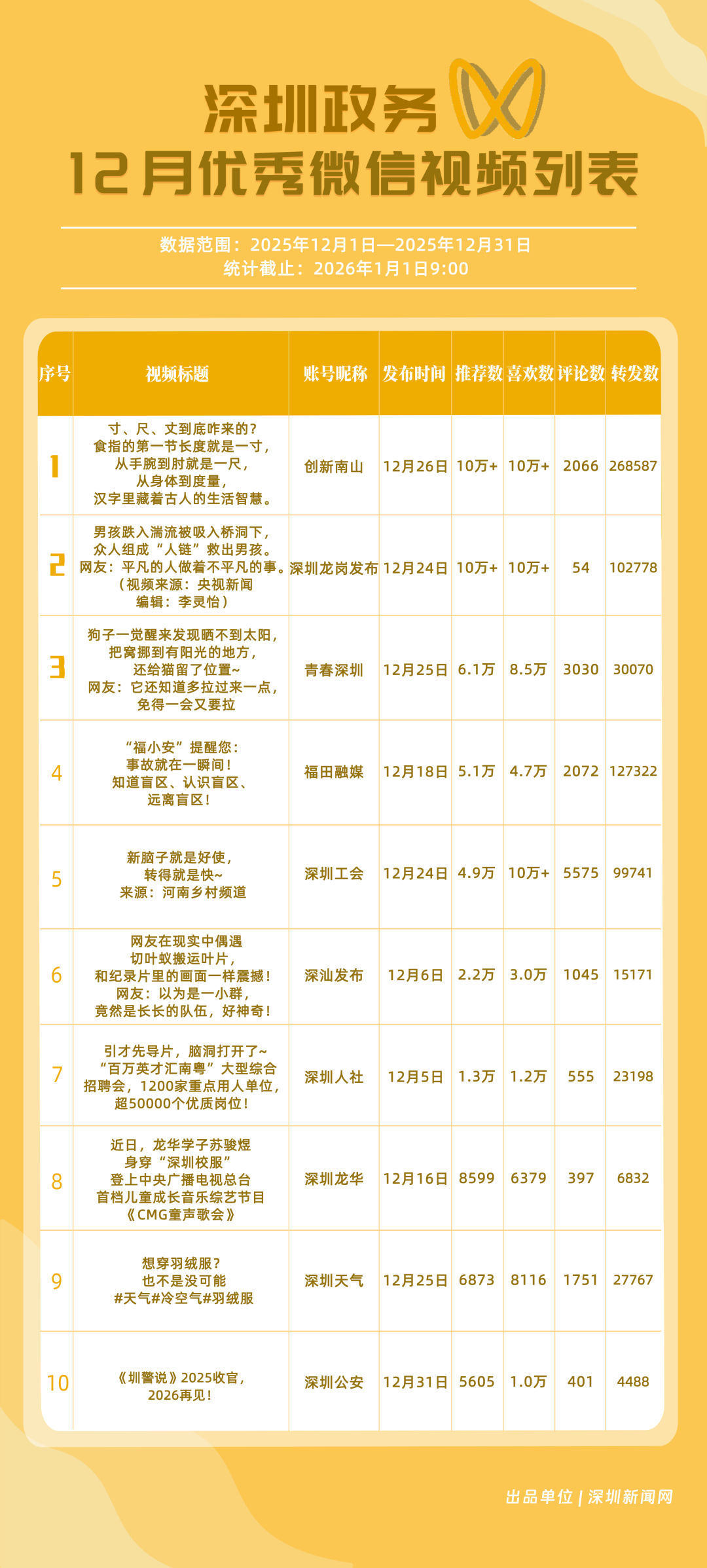 12月,“創(chuàng)新南山”“深圳工會”“青春深圳”“福田融媒”“深圳龍崗發(fā)布”“深汕發(fā)布”“深圳天氣”“深圳光明”“深圳龍華”“深圳人社”榮獲“優(yōu)秀政務(wù)微信視頻號”稱號。“創(chuàng)新南山”活躍指數(shù)、傳播指數(shù)均獲滿分,月作品總轉(zhuǎn)發(fā)量超70萬,領(lǐng)跑榜單;“深圳工會”積極發(fā)布熱點、民生類內(nèi)容,精準(zhǔn)對接市民需求,排名上升至第二名;“青春深圳”互動指數(shù)超98分,以高互動量位列榜單第三名?!案L锶诿健薄吧钲邶垗彴l(fā)布”兩賬號立足區(qū)域特色深耕內(nèi)容,得分超90分。上榜微信視頻號以輕量化短視頻為載體,傳播公眾喜聞樂見的政務(wù)、民生內(nèi)容,打造出兼具傳播力與親和力的政務(wù)宣傳新名片。