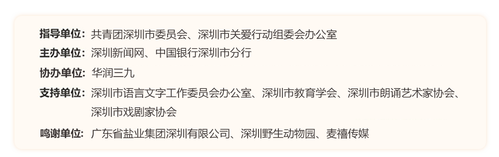 為助力建設良好的青少年閱讀環(huán)境,激發(fā)學生閱讀興趣,倡導親子閱讀,共建和諧家庭關系。2022年,“誰是故事大王·第六季”在共青團深圳市委員會、深圳市關愛行動組委會辦公室的指導下再出發(fā)。活動由深圳新聞網(wǎng)、中國銀行深圳市分行主辦,華潤三九協(xié)辦,得到了廣東省鹽業(yè)集團深圳有限公司、深圳野生動物園、麥禧傳媒的大力支持。更長的活動周期,更豐富的參與形式,更專業(yè)的賽制,等你來解鎖與挑戰(zhàn)!讓閱讀成為最動人的風景,讓故事的魅力感動深圳。說明:所有參賽者報名成功后,均承認并允許主辦方將個人參加本次活動的照片或視頻相關資料刊發(fā)在各類媒體雜志報紙上,用于活動宣傳。